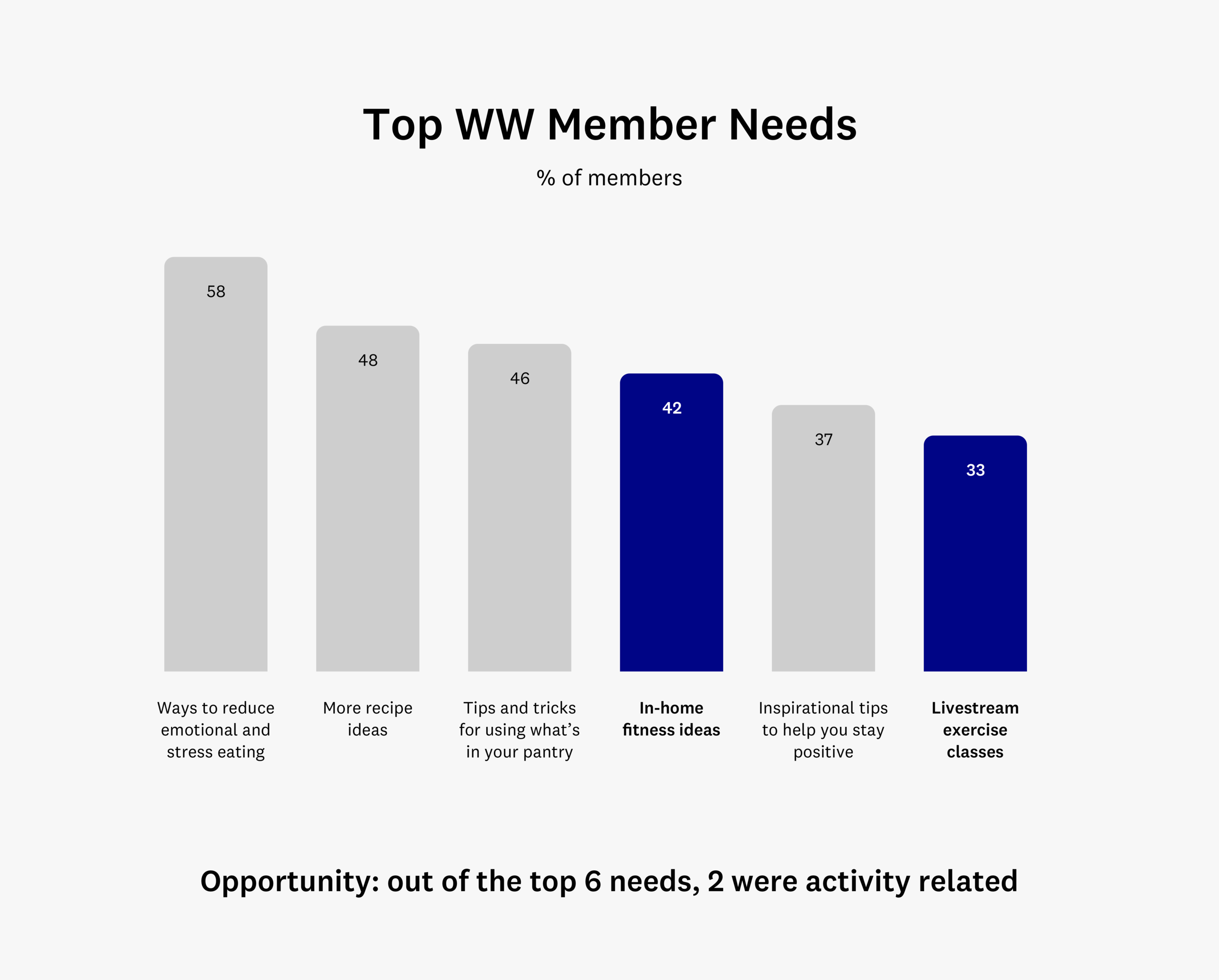 The WW core experience is its food program, but members did not see an explicit connection to activity. Therefore, members often forgot about it or did not view activity as a priority.