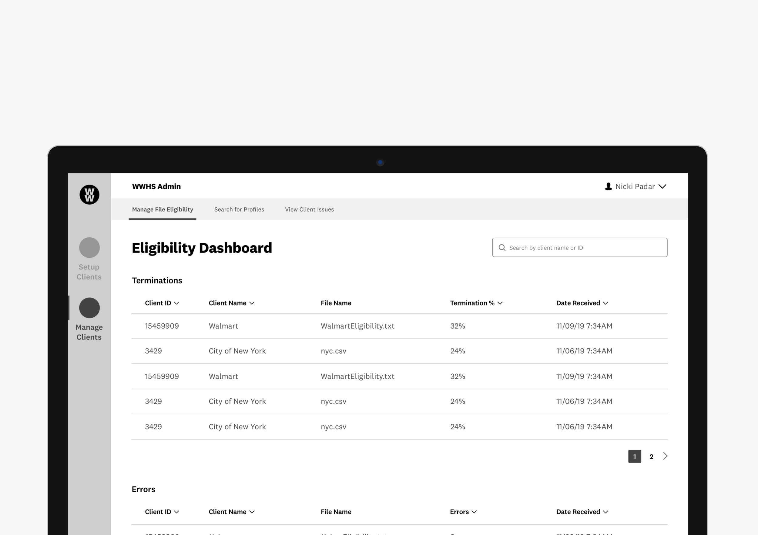 The dashboard is used to monitor and troubleshoot any client eligibility files that have errors or termination warnings. This helps the Operations team become more efficient in their day to day tasks by taking away numerous communication barriers between seeing what errors there are in the files and knowing who they should contact in order to fix it.