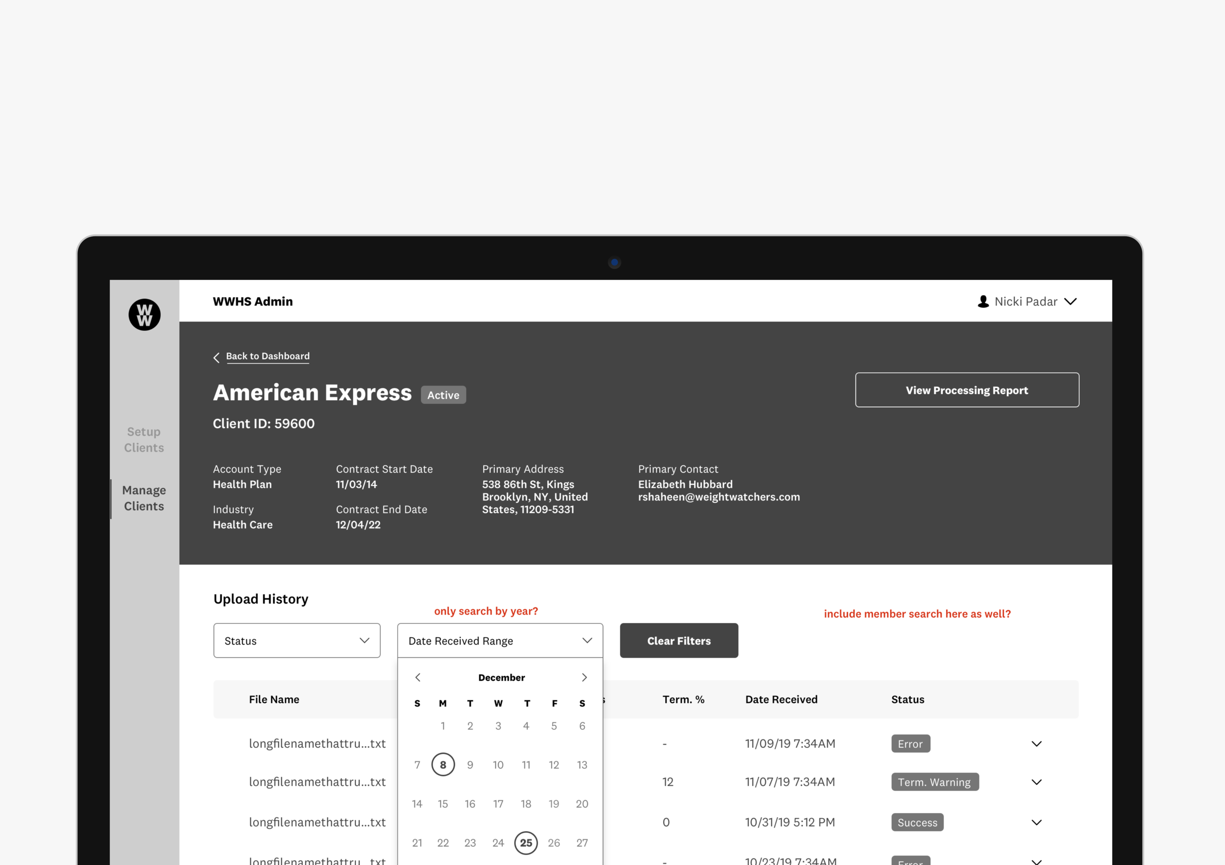 This feature is used to store a specific client’s profile information and file eligibility history. Account management can then use this tool to do cost analysis with their clients in an efficient manner. It also provides historical data on a client, something that did not exist before. This data is useful to account managers when trying to troubleshoot eligible population status issues.